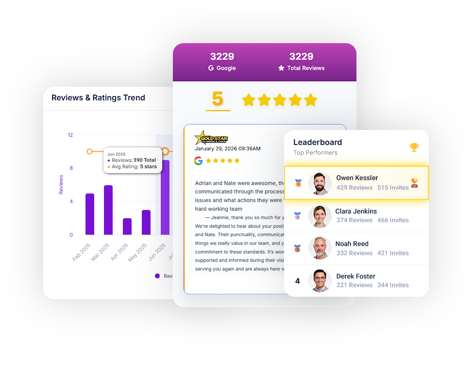 AI Reviews simplifies reputation management by automating review requests via text and email, generating intelligent responses, and tracking performance. With AI Auto Replies trained on your brand’s voice, you can respond instantly, stay on message, and improve visibility, trust, and search rankings.