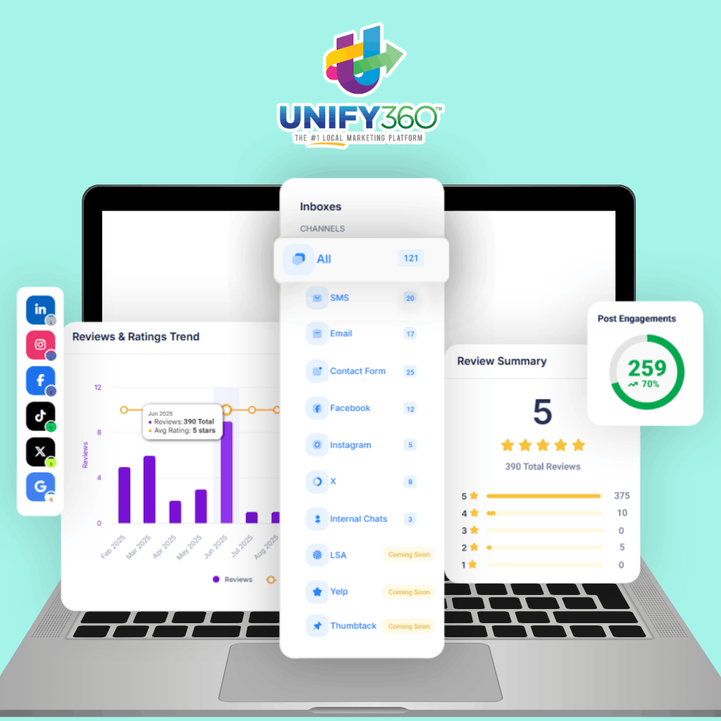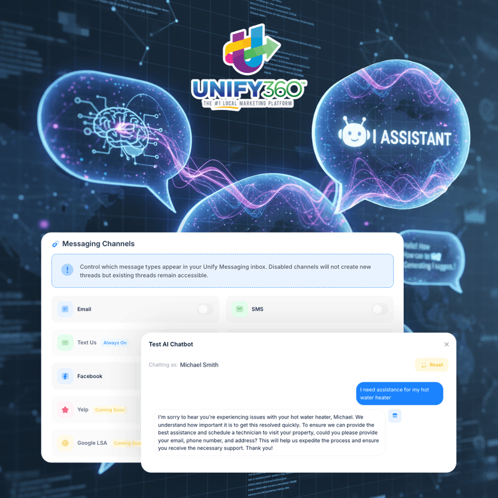 Unify360 helps your home service business attract more leads, strengthen your reputation, and manage every customer conversation from one intelligent AI-marketing platform. By combining AI-driven messaging, reviews, and social media tools, you stay connected, visible, and ahead of the competition.